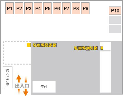 - ご来店時:①駐車スペースに車両を停車/②「駐車場発券機」にて駐車券を発行