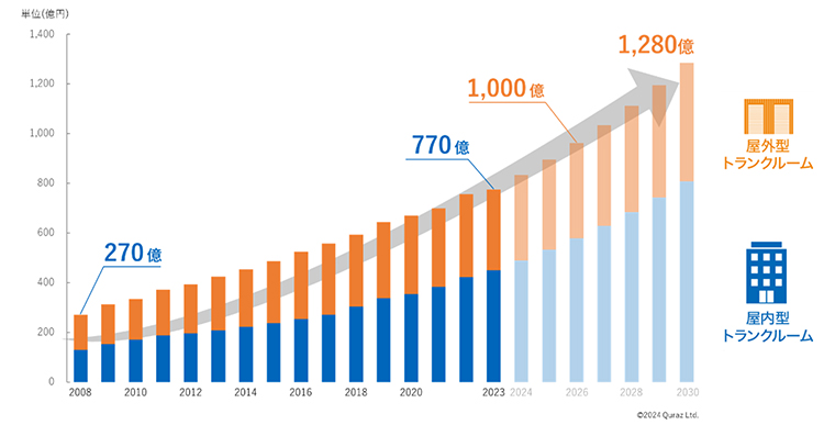 日本では、2001年にキュラーズ第1号店がオープン。日本のトランクルーム市場における新時代「品質の良い屋内型トランクルーム」の幕開けを告げることとなりました。海外市場と同様に日本市場においても、毎年約10%の成長を続け、2030年には1,300億円規模の拡大が見込まれています。