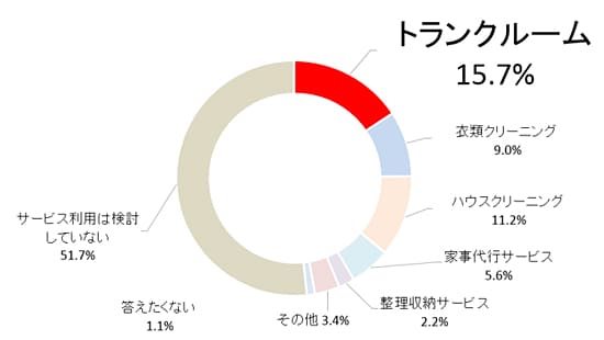 - “自宅の掃除・片付け”に伴って利用を検討したサービスは、“トランクルーム”が最多15.7%。