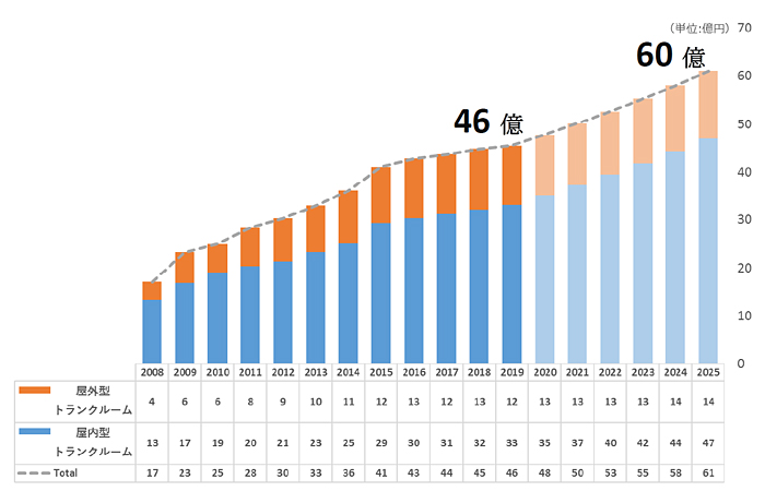 - 大阪エリアのトランクルーム市場規模は、2008 年比 2.7倍増となる46億円へと成長。2025年には60億円を突破する可能性を秘めている。