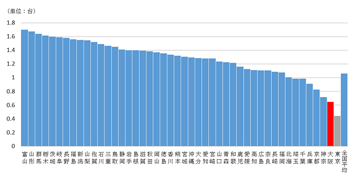 近年、日本全国における自家用車の世帯当たり普及台数は2006年の1.11台をピークに減少傾向が続き、2017年には1.06台と18年前の水準まで低下しました。