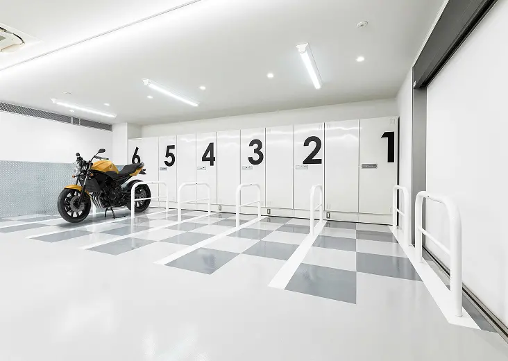 ガレージタイプのバイクパーキングには、電源コンセント・有孔ボード・収納棚・ロッカーなどが設置されており、簡易的な作業は可能です。ただし、基本的には保管専用スペースのため、整備や洗車などの作業は制限される場合があります。