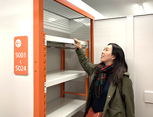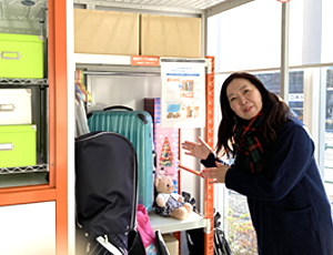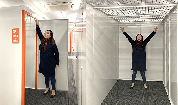 0.5畳や0.7畳をご案内。同じスペースでも長方形や正方形など形のバリエーションがあります。収納したいものをイメージして選ぶのがおすすめ。高橋さんは、実際にスペースの中に入って広さを実感。4畳の大型スペースでは両手を拡げて「まるで部屋みたい~♪」