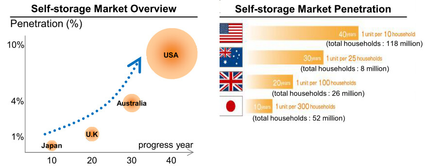 The Self-Storage industry in the U.S is by far the largest market in the world with more than $22 billion USD in annual revenue. The very first self-storage facility was said to be opened in 1958 and now there are more than 49,000 facilities - that is more than 4 times number of Starbucks facilities in the U.S.1,2 In comparison the market in Asia is relatively young and still developing, but growth in the last decade has drawn attention to the opportunity in this region. The Japanese self-storage market is said to be growing by roughly 10% per year on current $250 million USD annual revenue.