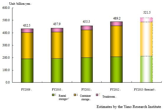 Our market survey results show that the market size of storage services (rental storage, container storage and trunkroom) in Japan increased 7.4% year on year to \48.92 billion in FY2012. Although growth was slowed for a while by the global recession from late 2008, since 2011 it has been back on track and the market has expanded against a backdrop of increased service sites and an upward trend in the operating rate of storage space.