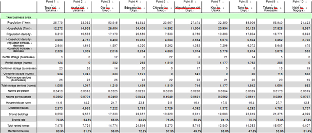 Among the top ten, five are in Tokyo, two in Saitama Prefecture, and one each in Kanagawa, Osaka and Aichi Prefectures, indicating that there are more storage services in areas of high population density (and especially relatively residential areas.)
