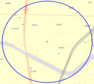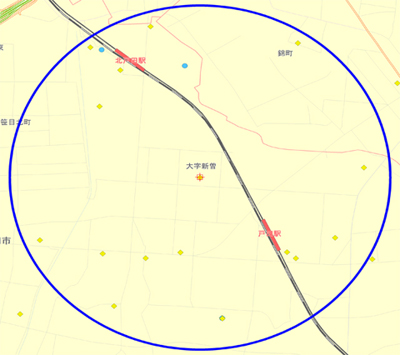 I have picked out the areas where there are a lot of rental storage rooms per household (around 0.1 RS rooms per household.) I selected this level of 0.1 because it is almost the same as that of self-storage rooms per household in the US. Business area size actually differs depending on the scale of business units (the total number of rooms per business unit), but because there were relatively many urban area business units this time, I have only considered the data within business areas of one kilometer in radius. I will therefore introduce areas with full data.