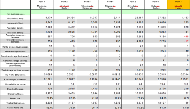 Point 1 in Minato-ku, Tokyo is in an area dense with business and commercial facilities so although it is urban it has a low population within its business area. Twelve rental storage business units have been developed there. The number of RS (rental storage) rooms per household is therefore in excess of 0.1. Other points (Points 4 and 5) in Chiyoda-ku, Tokyo, which has many business units, are also in areas with a lot of rental storage.