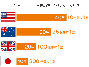 世界のトランクルーム市場はおよそ40年前にアメリカにて初めて誕生いたしました。