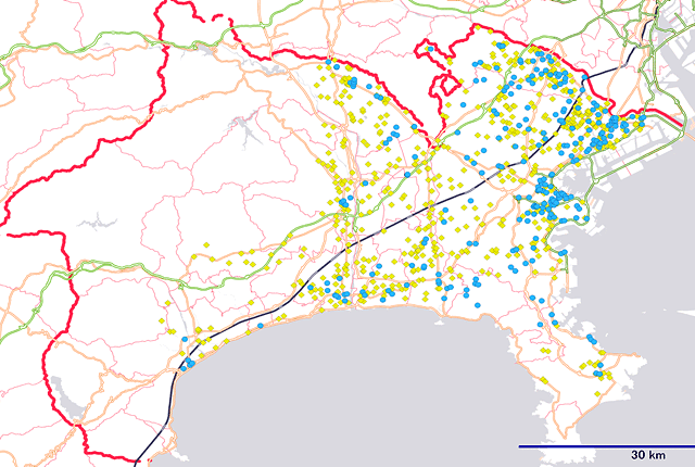 日本全国至る所に収納サービスが広がっていますが、人口の多い都市部にサービスが集中しています。そこで、今回は人口第2位の神奈川県の収納ビジネスについてレポートします。 都道府県の人口ランキングの上位3都府県(東京・神奈川・大阪)における収納ビジネス(トランクルーム・レンタル収納・コンテナ収納)の現状をみていきたいと思います。第3回は神奈川県です。日本の2番目の都市として大阪府をイメージされる方も多いかもしれませんが、人口数ではわずかな差ではありますが神奈川県が第2位なのです。しかし世帯数となると、大阪府が第2位となります(平成26年1月1日住民基本台帳 人口・世帯数)。同様に、以下のような各統計で、神奈川県と大阪府は拮抗しているケースが多くなっています。 <神奈川県の統計> ※カッコ内は都道府県のランキング