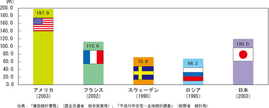 欧米の住宅と比較すると、日本の住宅は「狭い」と世間一般的に言われていると思います。世界各国の統計から住宅の広さを比較してみると、アメリカには圧倒的にかなわないものの、欧州各国と比較しても、劣等感を得るほどの差はないと読み取ることができます(※ただし、各国の統計による平均床面積の算出方法や新築のみ、住宅ストックの平均など比較する数字が異なっています)。 <各国の新設住宅の一戸当たり平均床面積>