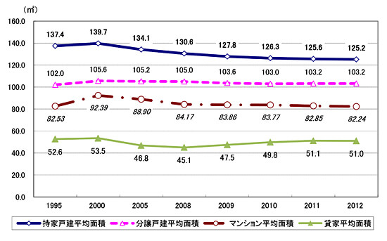 日本の新築住宅の平均床面積のトレンドをみると、次のグラフのとおりとなっています。ある程度予想通りといえますが、注文住宅が最も大きく、次いで分譲戸建・分譲マンション・賃貸住宅となっていて、注文戸建と賃貸住宅では2倍以上の広さの違いがあります。時系列で広さのトレンドをみると、ほぼ横ばいで推移していることがわかります。もう少し古いデータと比較すれば、1住戸あたりの面積は広くなっていますが、近年では「より広く」というトレンドにはないものと思われます。要因としては、1住戸あたりに生活する世帯人数の減少(核家族化・少子化等)、広い1軒の土地を分筆して複数の新築住宅を建築・分譲する「ミニ開発」が都市部で増えていることなどが考えられます。 住宅ストック(中古住宅)も既に多く存在し、販売用・賃貸用ともに、様々な住居の選択肢が増えているため、新築住宅の「広さ」のトレンドは、今後も横這いで推移するものと考えられます(直近のトレンドは、消費税増税・建築コストの高騰により、ダウンサイズの方向に進むと考えられます)。
