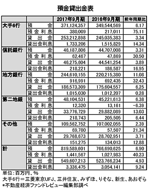 貸出の原資となる預金残高は819兆5896.01億円で52兆8989億円増(6.90%増)。すべての属性で残高が増えているが、とくに大手6行が21兆5797.88億円増(6.17%増)、地方銀行が24兆3947.75億円増(11.08%増)と増加額が大きい。金利がほぼゼロにもかかわらず、一定の預金が金融機関に集まっている。第二地銀は預金残高を2兆8829.18億円(6.38%)増やしたが、預金利息を8.41億円(6.39%)減らしており資金を効率的に集めている。 ただし、こうして集まった資金に対する預金利息負担が各金融機関に大きくのしかかっている。預金利息総額は4135.84億円(40.23%)も増えている。大手6行は1629.98億円(75.11%)、地方銀行は2245.56億円(32.43%)それぞれ増え、増加幅が大きい。貸出金利息総額は2823.34億円増なので、この額と単純比較しただけでも利息負担増が大きいことがわかる。(「不動産経済ファンドレビュー」2018年1月25日号)