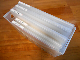 ファイルには、ポケットの数だけ目いっぱい入れると、膨れて使いづらくなるので、入れた時に、厚みが背表紙の幅を超えないように気をつけましょう。ムリして入れずに、種類毎にファイルを分ければ、膨らみすぎず、探すのもカンタンです。